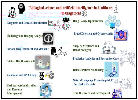 Figure 4. Biological science applications or justifications for artificial intelligence in healthcare management. - xRapid-Lab and xRapid-Malaria: These iOS-based mobile applications detect malaria using computer vision algorithms to analyze blood smear images obtained through a digital microscope. These tools provide real-time data on parasite counts and red blood cell (RBC) levels, achieving over 98% accuracy [65,67]. However, its accuracy can vary depending on the smartphone camera and lighting conditions. In resource-limited and remote settings, it might face some limitations in terms of scalability as it requires stable electricity, internet connectivity, trained personnel, and seamless integration with existing healthcare systems. But these challenges can be addressed by deploying adaptable, localized solutions fit for the unique needs of each environment, such as using portable solar chargers, an offline local data storage system that is periodically uploaded to the central system, developing simplified, multilingual training modules and peer-to-peer training models, and collaboration with local health authorities for designing compatible data management systems.