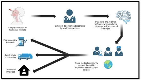 The accuracy and reliability of traditional diagnostic methods have been significantly enhanced through AI analysis, leveraging extensive genomic, radiomic, phenomic, and pathogenic databases [71]. AI also offers the potential to reduce dependency on biopsy-based diagnostics, paving the way for non-invasive techniques. By facilitating the development of advanced tools that detect diseases through chemical, vocal, and visual indicators—such as biosensors—AI enhances diagnostic capabilities and supports long-term disease surveillance. These tools help determine prognoses and inform treatment options. Figure 5 provides a simplified model visualizing how AI-based analysis of medical data input can provide rapid solutions to epidemic diseases by assisting in supply chain optimization, creating quarantine and control strategies, and providing analytical assistance in pharmaceutical studies for treatment and prevention.