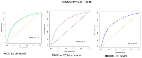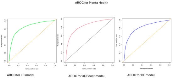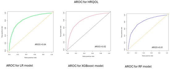 According to model performance on the test data, the predictive accuracy of the ML models for HRQOL was 0.77 [0.76–0.78] for LR, 0.73 [0.72–0.78] for XGBoost model, and 0.74 [0.73–0.75] for RF model. When predicting physical health, the accuracy was 0.71 [0.70–0.72] for LR, 0.70 [0.68–0.72] for XGBoost, and 0.70 [0.68–0.71] for RF model. For predicting mental health, the accuracy was 0.77 [0.76–0.78] for LR, 0.74 [0.73–0.75] for XGBoost, and 0.72 [0.71–0.73] for RF model (Table 1). The area under the AUC-ROC values ranged between 0.81 and 0.84 for HRQOL, 0.74 and 0.76 for physical health, and 0.83 and 0.86 for mental health (Figure 1, Figure 2 and Figure 3).