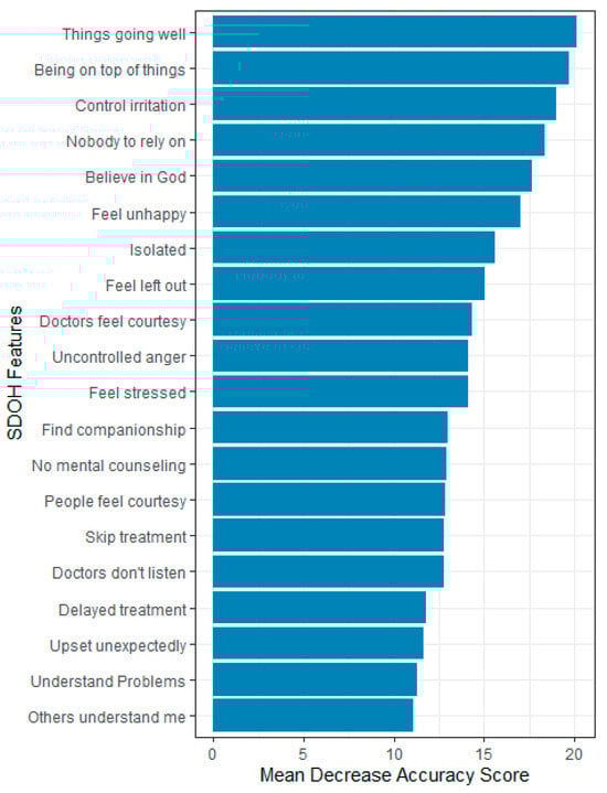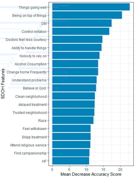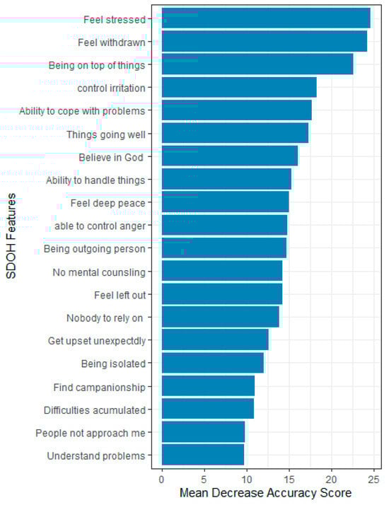 Overall, 87 features were evaluated based on their relevance in predicting HRQOL using the mean decrease accuracy score. Only 20 most important features that influence the prediction accuracy or performance of the ML models were reported. The top five most important features for predicting HRQOL were the feeling that things were going as expected, the ability to stay on top of things, the ability to control irritations, the perception of having no one to rely on for help, feeling God’s presence, and feelings of unhappiness.