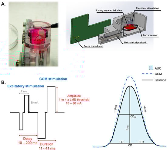 Cardiac contractility modulation (CCM) is a novel device-based therapy for patients with refractory symptomatic heart failure (HF) []. CCM stimulation enhances myocardial contractility by delivering non-excitatory electrical pulses of high voltage and long duration to the failing myocardium during the absolute refractory period [,]. As such, CCM does not elicit a new contraction but provides inotropic enhancement of contractility by increasing systolic levels of intracellular calcium [,]. CCM stimulation of the right ventricular septum improved global contractility, ejection fraction, functional outcomes, and quality of life and elicited reverse remodeling similar to cardiac resynchronization therapy in HF patients [,]. However, more studies are necessary to determine whether CCM improves long-term outcomes, such as survival and HF hospitalizations [,]. Continuous efforts are needed to identify true responders to CCM therapy, understand the exact mechanisms, and optimize the contractile response to CCM stimulation []. Recent studies in 3D human-engineered cardiomyocytes and neuro-cardiac coculture indicated that CCM stimulation settings may impact cardiomyocyte contractile improvement, but these models still lack mechanical loading and physiological resemblance [,]. In the current study, living myocardial slices (LMS) from end-stage HF patients were used to evaluate the acute impact of CCM stimulation parameters on the biomechanical properties of the human failing myocardium.