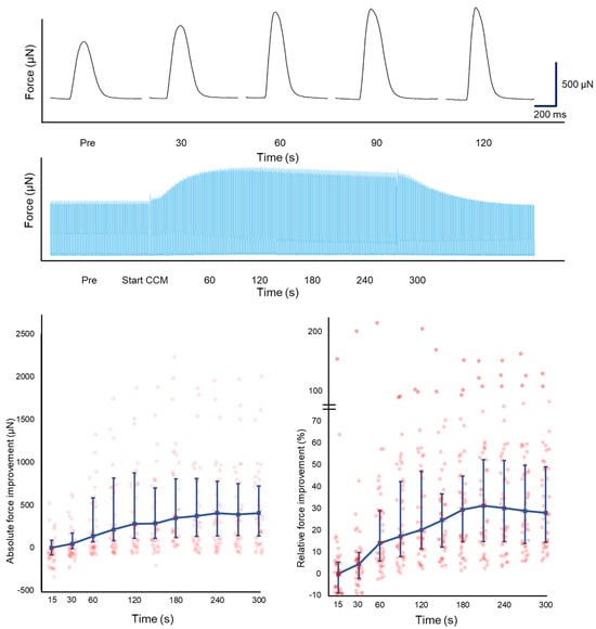 Variation in Fmax was observed between LMS in response to CCM, even within different LMS produced from the same patient. A total of 42 LMS (70.0%) had a positive inotropic response to CCM, 11 LMS (18.3%) showed a negative inotropic response to CCM, and 7 LMS (11.7%) had a neutral response. In LMS with a positive inotropic response (n = 42), CCM increased Fmax by 19.5% (CCM: 1324 (801–2738) vs. baseline: 1066 (626–2113) µN, p = 0.03), while enhancing AUC (CCM: 306 (192–581) vs. baseline: 243 (156–461) µN.s, p = 0.04) and reducing CD50 (CCM: 217 (202–242) vs. baseline: 224 (216–252) ms, p = 0.04). These results are presented in Table 3 and Supplementary Table S5. In LMS with a positive inotropic response, Fmax increased gradually for up to 3 min and then stabilized (Figure 2), which disappeared after cessation of CCM stimulation.