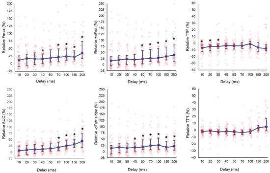 LMS displayed enhanced Fmax in a delay-dependent manner, as illustrated in Figure 3 and Supplementary Table S1. The AUC, dF/dt, and -dF/dt were enhanced with increasing delay settings (Figure 3). A reduction in TTP was observed at delay ≤ 30 ms (delay 30 ms; TTP; CCM: 158 (138–176) vs. baseline: 170 (159–185), p = 0.05).