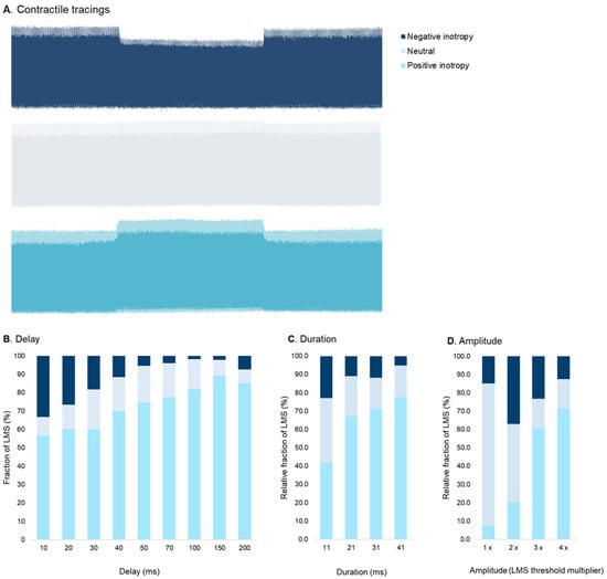 (A): Contractile tracings of HF-LMS with a negative, neutral, and positive inotropic response during CCM stimulation. (B–D): Inotropic response of HF-LMS to varying CCM stimulation parameters. A higher fraction of LMS showed a positive inotropic response with increasing CCM pulse delay, amplitude, and duration. Fractions were calculated for pulse delay 10 (n = 60), 20 (n = 60), 30 (n = 60), 40 (n = 60), 50 (n = 55), 70 (n = 49), 100 (n = 55), 150 (n = 47), and 200 ms (n = 53); pulse duration 11 (n = 48), 21 (n = 64), 31 (n = 59), and 41 ms (n = 58); pulse amplitude 1× (n = 54), 2× (n = 54), 3× (n = 56), and 4× threshold (n = 56).