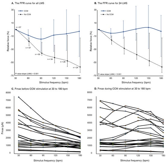 (A): Partial reversal of the negative force-frequency relationship (FFR) with CCM stimulation. The number of included LMS at higher frequencies decreased from 57 to 24 due to exclusion of LMS when contractions did not capture all electrical stimuli. (B): The FFR of 24 LMS with capture of all pacing frequencies (30 to 180 bpm). (C,D) illustrate the Fmax of 24 LMS before and during CCM stimulation at 30 to 180 bpm, respectively.