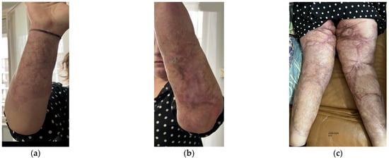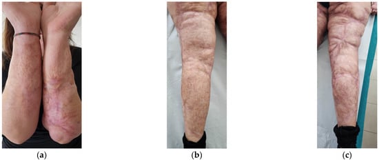 Details of the burns results. (a) Diffuse fibrotic scar on the right forearm; (b) Diffuse fibrotic scar on the left forearm with skin retraction and tissue depression; (c) Both the legs presented severe wide scars, fibrotic areas, skin retraction, areas of tissue depression, keloids, hypertrophic scars, and pigmentation disorders. The aesthetic problems were strictly correlated to functional motor problems.
