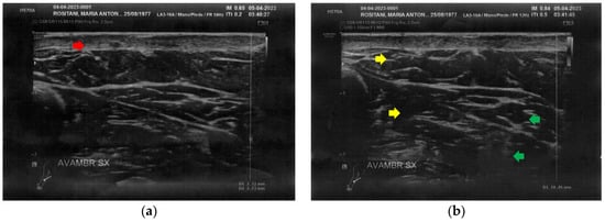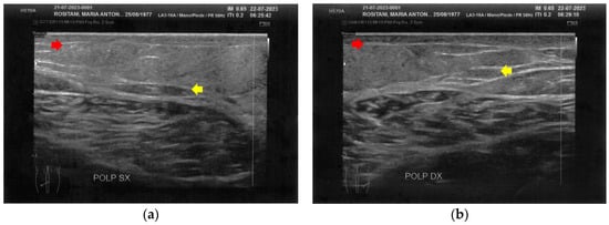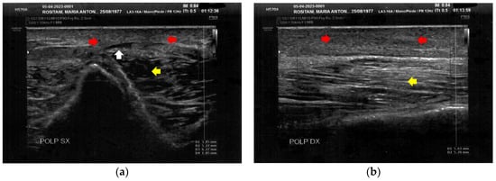 Ultrasonography of the calves at T0. (a) Cicatricial fibrosis (red arrows) is evident on the left calf on the superficial layers. Phlogosis extends to the deeper layers (yellow arrow). A small fluid element (white arrow) is observed at the muscular level; (b) Cicatricial fibrosis (red arrow) is also evident on the right side, where the muscular structure (yellow arrow) appears preserved.