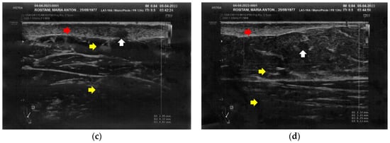 Ultrasonography of the forearms at T0. (a) Cicatricial fibrosis (red arrow) of the left forearm involves the whole dermal layer; (b) The inflammation (yellow arrows) is extended down to the deeper layer and, in particular, it involves the surgical grafts (green arrows); (c) Cicatricial fibrosis (red arrow) is also evident on the right side, where the adipose tissue appears inhomogeneous (yellow arrows) and where a cicatricial granuloma is present (white arrow); (d) The aspect described in Figure 2c is similar in other areas of the right forearm, where other cicatricial granulomas are present (white arrow).