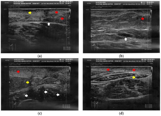 Ultrasonography of the popliteal fossae at T0. (a) Wide section of cicatricial fibrosis (red arrow) of the left popliteal fossa with absence of clear anatomic layers (yellow arrow) and presence of a cicatricial granuloma (white arrow); (b) In another area of the left popliteal fossa the inhomogeneity of the tissues is evident (yellow arrow), and another cicatricial granuloma (white arrow) is present; (c) Cicatricial fibrosis (red arrow) is also evident on the right side, where the adipose tissue appears inhomogeneous (yellow arrows) and where multiple cicatricial granulomas (white arrow) are present in the deeper layer; (d) In another area of the right popliteal fossa, the superficial fibrosis (red arrows) appear less thick, and a partial restructuring of the deeper anatomical layers is noted (yellow arrow).