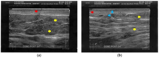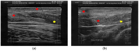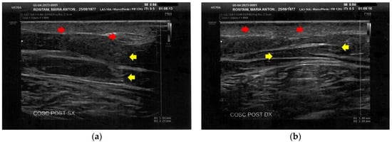 Ultrasonography of the posterior thighs at T0. (a) On the left thigh, cicatricial fibrosis (red arrows) is evident on the superficial layers, and phlogosis extends to the deeper layers (yellow arrows); (b) On the right thigh, cicatricial fibrosis (red arrows) is present as on the left side, and the deeper layers present an inhomogeneous restructuring (yellow arrows).