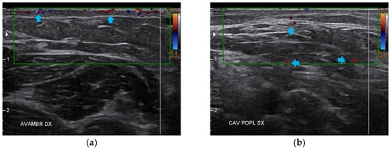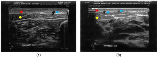 Ultrasonography of the forearms at T1. (a) A significant reduction of the cicatricial fibrosis (red arrow) is evident on the left forearm. A restructuring of all layers is also appreciable (yellow arrow). Moreover, some superficial vascular elements (blue arrow) are present; (b) The right forearm presents the same ameliorations described for the left forearm.