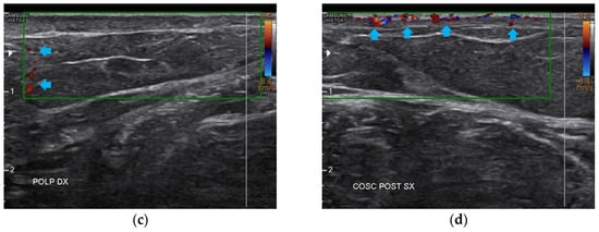 Doppler ultrasound of the four areas analyzed. (a) Right forearm; (b) Left popliteal fossa; (c) Right calf; (d) Left posterior thigh. All the areas present a clear revascularization (blue arrows) extending to the deeper layers, particularly on the popliteal fossae and calves.