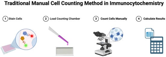 Traditional cell counting method in immunocytochemistry images. An outline of the traditional approach to cell counting using fluorescence microscopy for immunocytochemistry datasets. The method leverages fluorescence labeling to visualize cellular components and identify specific cell types or biomarkers within the sample. By manually counting the fluorescently labeled cells under a microscope, researchers can quantify cell populations and assess changes in cellular morphology or distribution for various applications, including disease diagnosis. However, it is time-consuming, error-prone, and often irreproducible. Created with BioRender.com.
