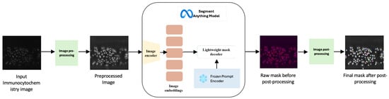 Overview of IDCC-SAM—beginning with the input immunocytochemistry image, which undergoes image preprocessing using CLAHE to enhance illumination. The preprocessed image is then fed into the Segment Anything Model (SAM), where the image encoder converts it into high-dimensional feature embeddings. These embeddings are processed by the lightweight mask decoder to generate raw segmentation masks. Finally, image post-processing is applied to refine the masks and perform cell counting. The prompt encoder is frozen as IDCC-SAM is designed as an automated end-to-end pipeline without human-in-the-loop.