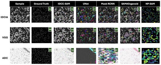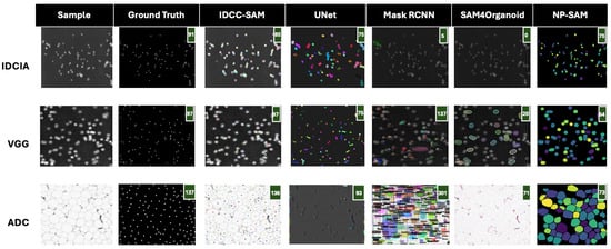 In Figure 4 and Figure 5, we present qualitative comparisons of IDCC-SAM and four benchmark methods (UNet, Mask RCNN, SAM4Organoid, and NP-SAM) on three datasets: IDCIA, VGG, and ADC. The performance is evaluated in terms of how closely the predicted cell counts match the ground truths, with predicted counts displayed in green in the top-right corner of each mask. A perfect alignment between ground truth and predictions is desirable, with lower deviations indicating better performance.