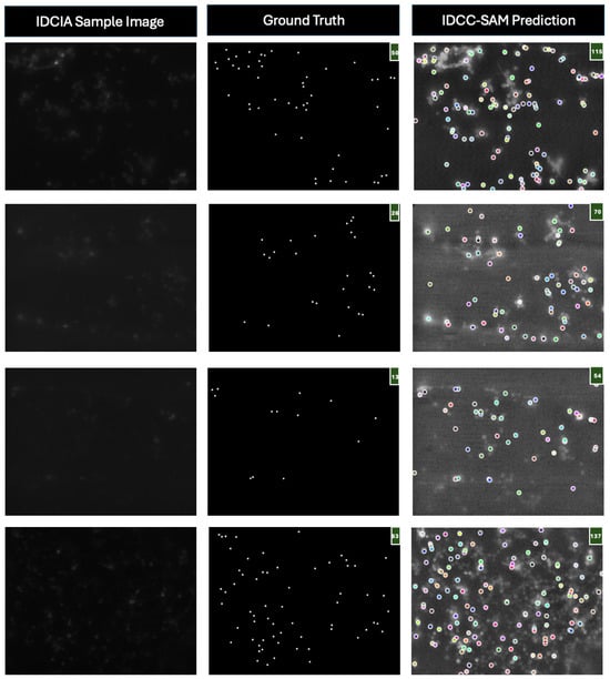 Overall, IDCC-SAM’s superior performance in lower-density scenarios highlights its strength in accurately segmenting and counting cells when they are more dispersed. This is due to its effective mask generation (inherited from SAM []) and the post-processing technique we introduced, which allows for more precise cell identification and counting. However, the decline in performance with higher cell densities shows limitations in handling overlapping and occluded cells, which become more prominent in densely packed cellular images, particularly for a dataset like IDCIA. The fixed patch size and resolution of the ViT encoder in IDCC-SAM may contribute to losing essential details needed for distinguishing closely packed cells. Furthermore, the absence of fine-tuning with high-density training data—a benefit seen in models like UNet and Mask RCNN—also justifies why they may perform better than IDCC-SAM in some datasets. To address these challenges, our future work will explore incorporating few-shot fine-tuning, adjusting the ViT encoder’s resolution and patch sizes to become dynamic to different cell densities, and integrating domain-adaptive mask decoders into the IDCC-SAM architecture (while still limiting the need for large labeled datasets or computationally expensive training).
