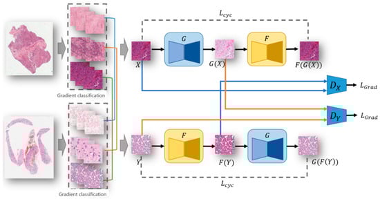 - The pair constraint strategy was used to train the adversary-generative network. Simply put, when selecting the input images of the adversative generation network, it is necessary to pair them according to the gradient density. Only images belonging to the same class of gradient density can pair the input network for training. The reason for this is that combinations of pictures with the same density gradient tend to have the same tissue structure, which can avoid learning the staining style of other tissue structures during the process of staining migration.