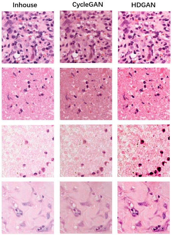 - Data augmentation based on staining is performed on digital pathological images to enable the model to learn more potential staining differences during training. This method forces the model to learn more texture-based features, but a lot of information in digital pathological images is reflected through staining, so this method may also enhance the generalization while reducing the performance of the model [34].