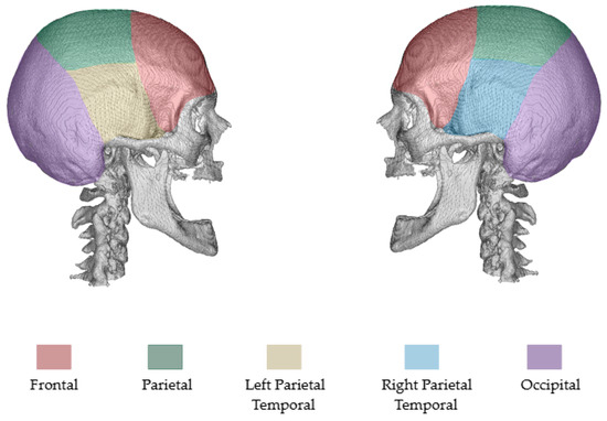 The process included identifying key regions to introduce defects: parietal [35], left parietal temporal [35], right parietal temporal [35], frontal [35], and occipital (in this paper, the regions of defects, including parietal, left parietal temporal, right parietal temporal, frontal, and occipital, will be referred to as follows for easier understanding: top, left, right, front, and back, respectively). Figure 2 illustrates the regions mentioned above, using coloured representations on an NRRD file from the MUG500+ dataset.