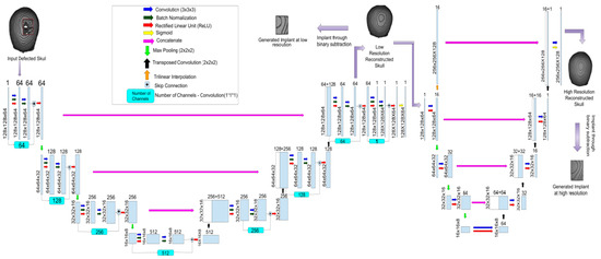 Defect generation was followed by the training of the AI model for the reconstruction of cranial regions of the skulls, enabling implants to be generated given the input of a defected skull. This section of the paper, therefore, proposes a novel AI-based model for the cranial reconstruction of defected skulls and implant generation. The architecture diagram of the proposed AI model, named Cranial Reconstruction and Implant Generation Network (CRIGNet), is presented in Figure 3. It primarily performs two tasks: cranial reconstruction to produce a lower-resolution output, followed by resolution enhancement to produce a final reconstructed skull of higher resolution. A low-resolution implant can be generated after the reconstruction network through Boolean subtraction, while for a higher-resolution implant, the reconstructed skull is passed through the resolution enhancement network, after which Boolean subtraction is carried out.