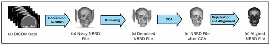 Preprocessing steps were applied to the raw dataset to obtain a consistent and standardized dataset. The preprocessing pipeline began with converting Digital Imaging and Communications in Medicine (DICOM) images to Nearly Raw Raster Data (NRRD) format to enable flexibility in processing and integration with various software packages. This step is part of a generalized pipeline that ensures applicability to real-time input images in DICOM format, though the acquired MUG500+ dataset was already in NRRD format and thresholded. The next step involved denoising, which was performed using the Median filter to remove Gaussian, salt-and-pepper, speckle, and visual noise commonly found in CT scan images [32,33]. Following this, CCA was applied to eliminate CT artefacts such as supporting plates and positioning aids, ensuring that only the skull morphology remained for further processing [34].