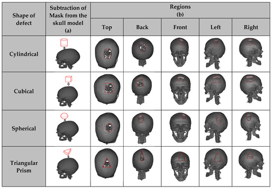 The raw skull dataset was augmented by dividing it into five primary regions: top, left, right, front, and back. Various defect types—spherical [36], cubical [36], cylindrical, and triangular prism—were then introduced into each of these regions. By systematically adding these defects to each region, a total of 20 types of defects were created, i.e., in each of the 5 regions, there are defects of 4 shapes: spherical, cubical, cylindrical, and triangular prisms (used interchangeably as triangular); this results in 5 × 4 = 20 cases.