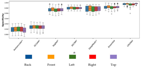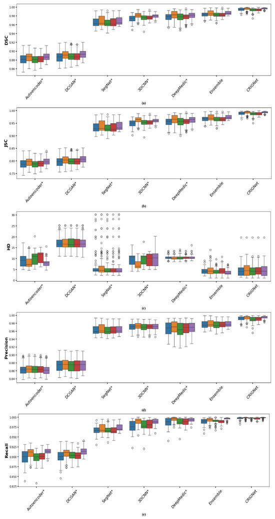 Table 3 presents a comparative analysis of autoencoder*, DCGAN*, SegNet*, 3DCNN*, DeepMedic*, ensemble, and CRIGNet based on various performance metrics averaged over a testing dataset of 720 files. It can be observed from the table that CRIGNet excels with the highest DSC (0.9948), JSC (0.9897), precision (0.9920), recall (0.9977), and specificity (0.9994), alongside a low HD value (4.6317 mm). The ensemble model, as a strong alternative, achieved a DSC of 0.9844, JSC of 0.9693, precision of 0.9774, recall of 0.9915, specificity of 0.9984, and HD of 4.1297 mm. Despite the impressive performance of the Ensemble model, CRIGNet outperforms it across all key metrics.