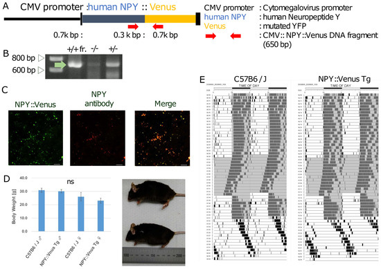 CMV::NPY::Venus plasmid DNA was provided by Takashi Tsuboi (University of Tokyo). It contained a CMV promoter, the human NPY open-reading frame (ORF) fused with Venus fluorescent protein, and the polyadenylation sites of simian virus (SV40) early genes in pcDNA3 (Figure 1A). A linearized DNA fragment of CMV::NPY::Venus, which was obtained via digestion with HindIII and XbaI, was microinjected into cryopreserved C57BL/6J mouse zygotes (CREA Japan Inc., Tokyo, Japan) to produce the Tg mice (RIKEN Kobe Campus, Hyogo, Japan) [26,27]. Linearized DNA fragments were microinjected into the cryopreserved C57BL/6J mouse zygotes to produce the Tg mice (Kobe RIKEN) [28].