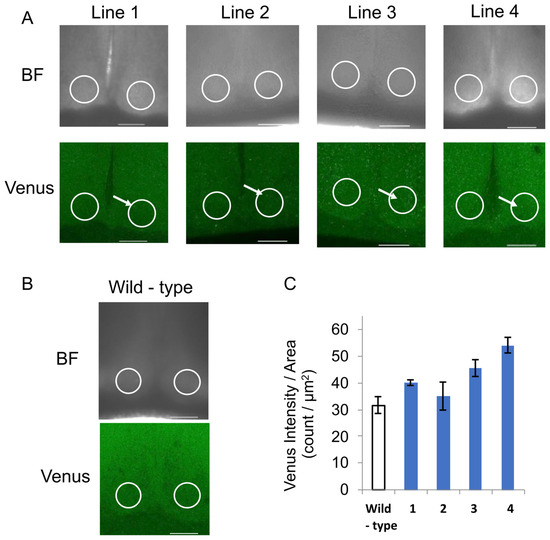 We generated NPY::Venus Tg mice in which a of fusion the protein of human NPY tagged with Venus, a mutated yellow fluorescent protein, was ubiquitously overexpressed under the control of the CMV promoter (Figure 2A). Four lines of NPY::Venus Tg mice (lines 1–4) were obtained via the transgene PCR screening of mouse tail DNA (Figure 2A,B). Lines 2 and 4 had the lowest and highest expression of NPY::Venus, respectively, according to the Venus signals in the center of the SCN where the NPY was secreted. Line 1 was used for subsequent experiments because Lines 3 and 4 were prone to overexpressing NPY::Venus while Line 2 expressed NPY::Venus unreliably, with large individual error values (Figure 2C). We confirmed that the development and activity rhythms of the Line 1 mice were similar to those of wild-type mice (Figure 1D,E).