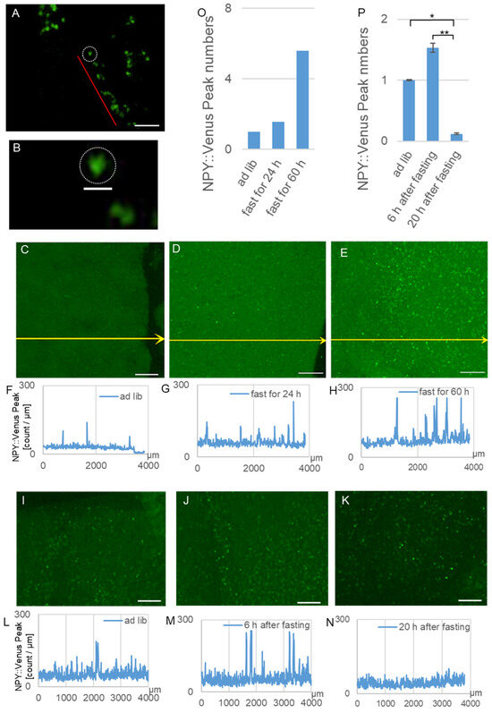 Fluorescence imaging of the NPY::Venus-containing secretory granules by super-resolution microscopy in the fasted mice. (A) Fluorescence image of the perinuclear NPY::Venus-containing secretory granules in an SCN slice acquired by super-resolution microscopy. Red line: secretory granules arranged in series. Scale bar: 1 µm. (B) Magnified image of the secretory granules along the red line around the SCN nucleus denoted by a white circle. Scale bar: 100 nm. (C) Image of the NPY::Venus fluorescence in the SCN of an NPY::Venus Tg mouse fed ad libitum. Scale bar: 500 µm. (D) Image of the NPY::Venus fluorescence in the SCN of an NPY::Venus Tg mouse that fasted for 24 h. (E) Image of the NPY::Venus fluorescence in the SCN of an NPY::Venus Tg mouse that fasted for 60 h. (F) Graph of the fluorescence intensity along the yellow arrow in (C). (G) Graph of the fluorescence intensity along the yellow arrow in (D). (H) Graph of the fluorescence intensity along the yellow arrow in (E). (I) Image of the NPY::Venus fluorescence in the SCN of a mouse fed ad libitum. Images of the NPY::Venus fluorescence in the SCN of mice fed (J) 6 h after fasting for 60 h and (K) 20 h after fasting for 60 h. (O) Total numbers of the cells in 10 yellow lines (shown in (C–E)) whose fluorescence intensities reflect the following three groups: the fed ad libitum group and the groups that fasted for 24 and 60 h (shown in (F–H)). (P) Total numbers of cells in 10 lines whose fluorescence intensities reflect the following three groups: the fed ad libitum group and the groups fed at 6 and 20 h after fasting for 60 h (shown in (L–N)). ** p < 0.005, * p < 0.01, Tukey–Kramer Test. In Figure 3A,B, n = 1. In Figure 3C–H,O, n = 1. In Figure 3I–N,P, n = 3.