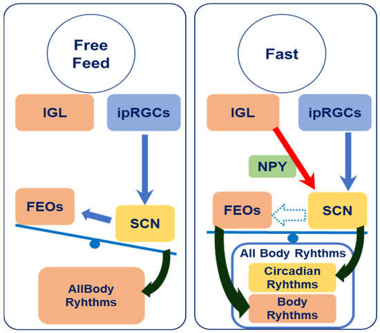 The conceptual framework of the interaction between the SCN and FEO under ad libitum and fasting conditions is illustrated in Figure 4. This interaction could be affected by elevated NPY secretion around the SCN. The FEO is regulated by the SCN under free-feeding conditions (left side), while feeding-related external cues attenuate the input of photo signals to the SCN and/or diminish the dominance of the SCN over the FEO when feeding requirements are increased (right side) [34]. The FEO may regulate body rhythms independently of the SCN. In a fasting state, the FEO and SCN could become desynchronized, resulting in the desynchronization of the peripheral tissues and the central SCN, as shown on the right side of Figure 4.