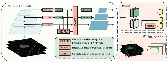 (2) We propose the Cross-Attention Adaptive Feature Pyramid Network (CA-FPN) with the Breast Density Perceptual Module (BDPM), which enhances inter-feature interaction across various scales and enhances the model’s focus on dense breast regions.