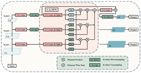 where i and j are indices representing the scale of the feature maps, N denotes the total number of feature maps at different scales, and represents the cross-attention computation function. From the equation, it can be observed that CA-FPN computes the cross-attention between the feature maps of the current scale and any other scale, including self-attention within the feature maps of the current scale. Subsequently, pixel-wise addition is performed to achieve weight fusion, ensuring the directness and effectiveness of the interaction between feature maps at different scales.