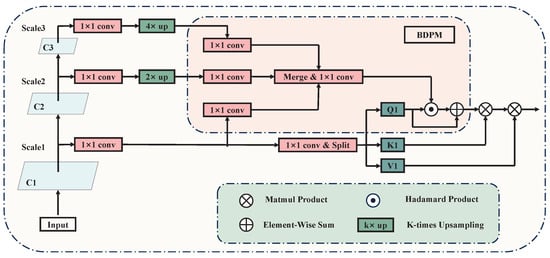 where i, j, and k represent the scale indices of the feature maps; denotes the normalization function; , and represent the feature mapping functions, with weights not shared among different scales, used to map the input feature maps into a different dimensional space. In this experiment, 1 × 1 convolutions are employed to map input feature maps of dimension C to feature spaces of dimension C/2, aiming to reduce computational complexity and memory usage. The superscript T denotes matrix transpose.