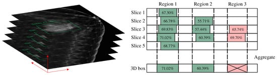 In this study, the algorithm employs a slice-by-slice detection and fusion approach to obtain the final three-dimensional prediction box, necessitating a post-processing operation for merging detection boxes. During the testing phase, all slices of each DBT volume are sequentially fed into the model to obtain the corresponding 2D detection boxes. These 2D detection boxes are then fused along the z-axis to yield the final 3D detection results. The specific method for merging 2D detection boxes into a 3D box is shown in Figure 5. First, the Intersection over Union (IoU) of the 2D detection boxes in adjacent slices is calculated. If the IoU exceeds a threshold of 0.5, the detections are considered to be of the same lesion. Furthermore, only if a lesion is detected in at least three consecutive slices will the bounding boxes be merged. For example, if a bounding box is detected in only two slices, as in the case of region 3, it is not considered a valid detection. The final 3D bounding box is the union of the 2D bounding boxes, ensuring that the entire detection is maximally included. The confidence score of the 3D bounding box is taken as the maximum confidence score among the 2D detection results.