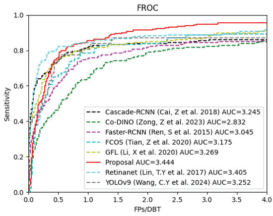 The FROC curves of the comparison methods [25,27,35,36,37,38,39] on mass-detection task.