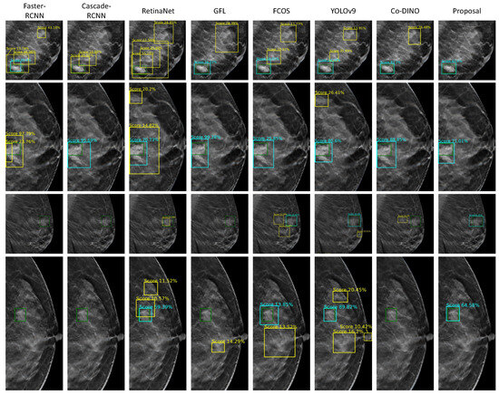 The previously mentioned algorithms exhibited varying degrees of false positives in dense glandular regions. This issue likely arises because the similar appearance of dense glandular tissue and masses increases the difficulty of differentiation. These algorithms fail to effectively integrate image feature information from different levels that is crucial for distinguishing such regions with their indirect and insufficient cross-layer feature-fusion methods. Notably, the proposed method successfully identifies these regions that are easily mistaken for FPs. This performance improvement may benefit from the CA-FPN, which enables effective integration of high-level semantic features and low-level detailed features. Additionally, the BDPM enhances the network’s ability to differentiate between high-density breast regions and masses. The UBM further adapts to the complex and variable boundaries, contributing to better performance in distinguishing these challenging cases.