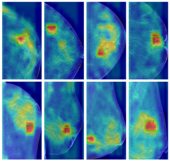 The heatmap visualization of the detection results using Grad-CAM, in which regions highlighted in red indicate areas of the feature map that receive higher attention from the network and regions depicted in blue represent areas with lower attention from the network. The green boxes represent ground truth. The proposed method effectively focuses on the ground truth regions, thereby achieving accurate detection results.