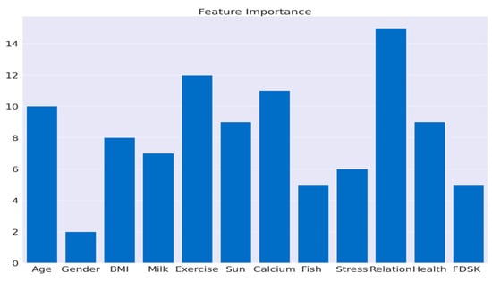 It is possible that the 12% importance given to exercise habits is due to increased exposure to the sun and its overall health benefits. Calcium intake and sun exposure played a role in vitamin D metabolism, with 11% and 9%, respectively. The age factor was 10%, which reflects age-related changes in synthesis. Moderate contributors were BMI (8%) and milk consumption (9%), while health issues (9%) and fish intake (5%) provided additional insights. The financial stress and FDSK scores (6% and 5%) indicated that dietary diversity was limited due to financial constraints, with gender having a minimal impact at 2%.