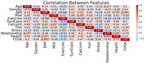 To make it easier to read, we emphasized strong correlations with an absolute value of the correlation coefficient (|corr|) exceeding 0.25 indicated with an asterisk (*) to these values. This guarantees that the key relationships between features are visible. In addition, we used an upper triangular mask to eliminate redundant values because correlation matrices have symmetry. A cleaner and more interpretable visualization is achieved by not displaying duplicate information. We effectively distinguished positive and negative correlations, and annotations are adjusted to improve clarity. Identifying significant correlations is made easier with the combination of these enhancements, while maintaining a structured and visually appealing presentation.