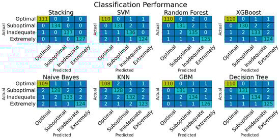 The confusion matrix of the ML classifiers used is depicted in Figure 3. The stacking model can perform well without any misclassifications, but it can occasionally misclassify samples between the ‘Optimal’, ‘Inadequate’, and ‘Extremely Inadequate’ categories. The base classifiers were struggling to capture subtle differences in feature values which could be the reason for this. Misclassification patterns in VDD detection are examined by various ML models including SVM [28], RF [29], XG Boost [30], NB [31], KNN [32], GBM [33], and DT [34] using different methodologies and assumptions. For instance, SVM struggles with overlapping feature distributions, while NB assumes feature independence, which leads to errors across all categories. By combing the strengths of multiple classifiers, the stacking model can prevent some of these errors.