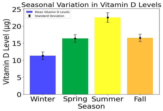 VDD’s seasonal variation is noticeable, and its mean values peak at 22.55 during the summer, followed by a decline in the fall (16.56) and spring (16.38), as shown in Figure 4. The winter season has a mean vitamin D level of 11.33 which is the lowest. This seasonal fluctuation’s degree of variability is reflected in the standard deviations, which vary between 1.07 in the fall and 1.43 in the summer, suggesting that levels vary more during the warmer months.
