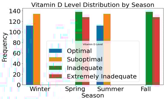 The distribution of VDD levels during each season is shown in Figure 5. The distribution presents a valuable insight into the influence of seasonal variations on vitamin D levels among participants. Due to reduced sun exposure, certain seasons, such as winter, may show higher levels of Suboptimal and Inadequate vitamin D, while other seasons, such as summer, may show more Optimal levels. Vitamin D levels vary throughout the year due to factors such as sun exposure, dietary habits, and lifestyle choices, influencing overall vitamin D levels. The accuracy of health recommendations and interventions can be enhanced by tailoring predictive models to account for seasonal fluctuations after analyzing these seasonal patterns.