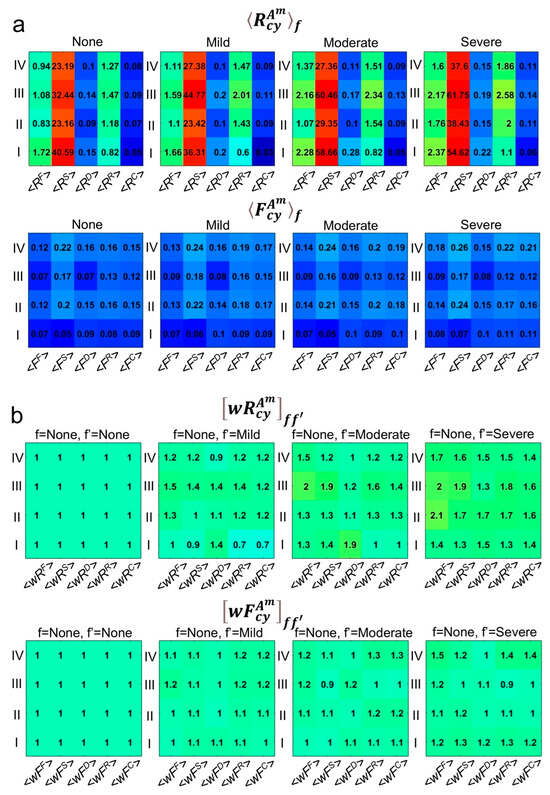 The averaged residuals and fluctuations calculated for m = F and cy = I in Figure 1, can be calculated for all cycles, cy = I, II, III, and IV and all measurements m = F, S, D, R, C, providing m × cy matrices, and , where f is a single functional group (see Figure 2a). It appears clear the tendency of (m, cy) elements in and matrices to assume largest value going from patients with no dysfunction towards patient with diagnosed severe dysfunctions. This trend suggests that as the masticatory system becomes more dysfunctional, the residuals and fluctuations become more pronounced. This observation led us to establish, for each patient, with age y, partial functionality degrees, and , for each measurement, Am, given by the summation of the calculated residuals and fluctuations on the different cycles, cy: