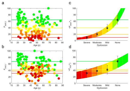 Total functionality indices (a) and (b) , grouped by (yellow full circles) mild, (orange full circles) moderate, (red full circles) severe, or (green full circles) no dysfunction diagnosed for the 157 patients. The colored horizontal lines are the averages of all ages of patients belonging to the different functional groups. The average and are highlighted by black full circles with their error bar on a chromatic color scale in panels (c,d), respectively. The colored zone is comprised between two exponential lines given by Equations (15) and (16) covering the error bars across the four functional groups.
