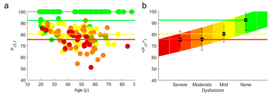 Total functionality indices (a) grouped by (yellow full circles) mild, (orange full circles) moderate, (red full circles) severe, or (green full circles) no dysfunction diagnosed for the 157 patients. The colored horizontal lines are the averages of all the ages of patients belonging to the different functional groups. The average (b) with its error bar on a chromatic color scale. The colored zone is comprised between two exponential lines covering the error bars in the four functional groups.
