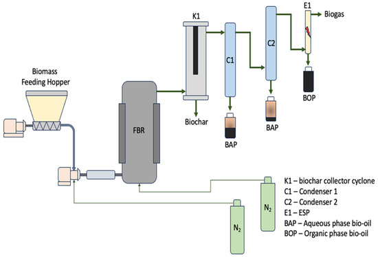 Schematic diagram for fast pyrolysis in a fluidized bed reactor (FBR).
