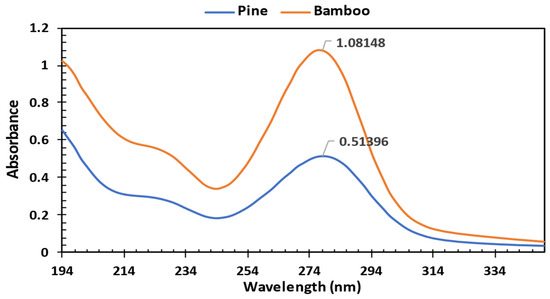 The UV/vis spectrophotometric analysis revealed distinct absorbance peaks for lignin in pine and bamboo biomass samples, with values of 0.51396 and 1.08148, respectively, at 280 nm (Figure 2). This wavelength corresponds to the typical absorbance range for lignin, attributed to its aromatic rings, which exhibit strong absorbance around 280 nm [46,47,48,49,50]. Although carbohydrates generally absorb in the 190–210 nm range [51,52,53], the current study specifically targeted lignin detection; hence, an absorbance range of 194–354 nm was selected. The significantly higher absorbance in bamboo suggests a relatively higher lignin content compared to pine, potentially impacting its degradation characteristics and suitability in biofuel applications.