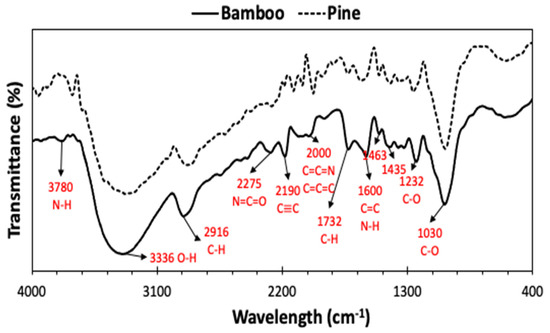 The categorization of biomass functional groups assists in understanding the chemical composition of the biomass sample, offering crucial insights for its analysis and utilization in thermochemical processes. Figure 3 illustrates the FTIR spectrum of biomass samples (bamboo and pine), revealing various functional groups through distinctive peaks. The broad peak observed at 3336 cm−1 denotes the O-H stretching vibrations of lignin and cellulose in the biomass. Similarly, the peaks at 2916 cm−1 signify the C-H stretching vibrations, indicating the presence of aliphatic compounds in the hemicellulose [58,59]. The peak at 1732 cm−1 originates from the C-H and C=O stretching vibration of oxygen double bonds in hemicellulose, which is also contributed to by lignin [60]. Aldehyde functionalities, mainly derived from xylose, are indicated by 1435 and 1463 cm−1 peaks, which may also relate to N-H bending, C=C stretching, and C-H bending vibrations. Bamboo biomass exhibits a significant presence of nitrogenous compounds compared to pine biomass, as seen in Figure 3. The peaks for these compounds were prominent in the bamboo biomass. Peaks observed between 1200 and 1600 cm−1 suggest O-H bending and S=O stretching resonances, hinting at carboxylic acid and sulfonate/phenol functionalities in the biomass. The peak at 1232 cm−1 signifies C-O stretching vibrations of lignin and xylan, along with syringyl ring breathing. The peak at 1030 cm−1 is associated with stretching vibrations of S=O/C-N functionalities (inorganics in biomass). Additionally, peak 1030 cm−1 was also attributed to the presence of cellulose I crystalline and C-O bonding [61,62].
