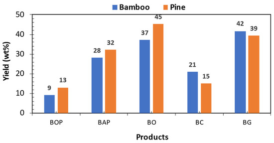 Fast pyrolysis product yields [BOP: bio-oil organic phase, BAP: bio-oil aqueous phase, BO: bio-oil, BC: biochar, and BG: pyrolysis gas].